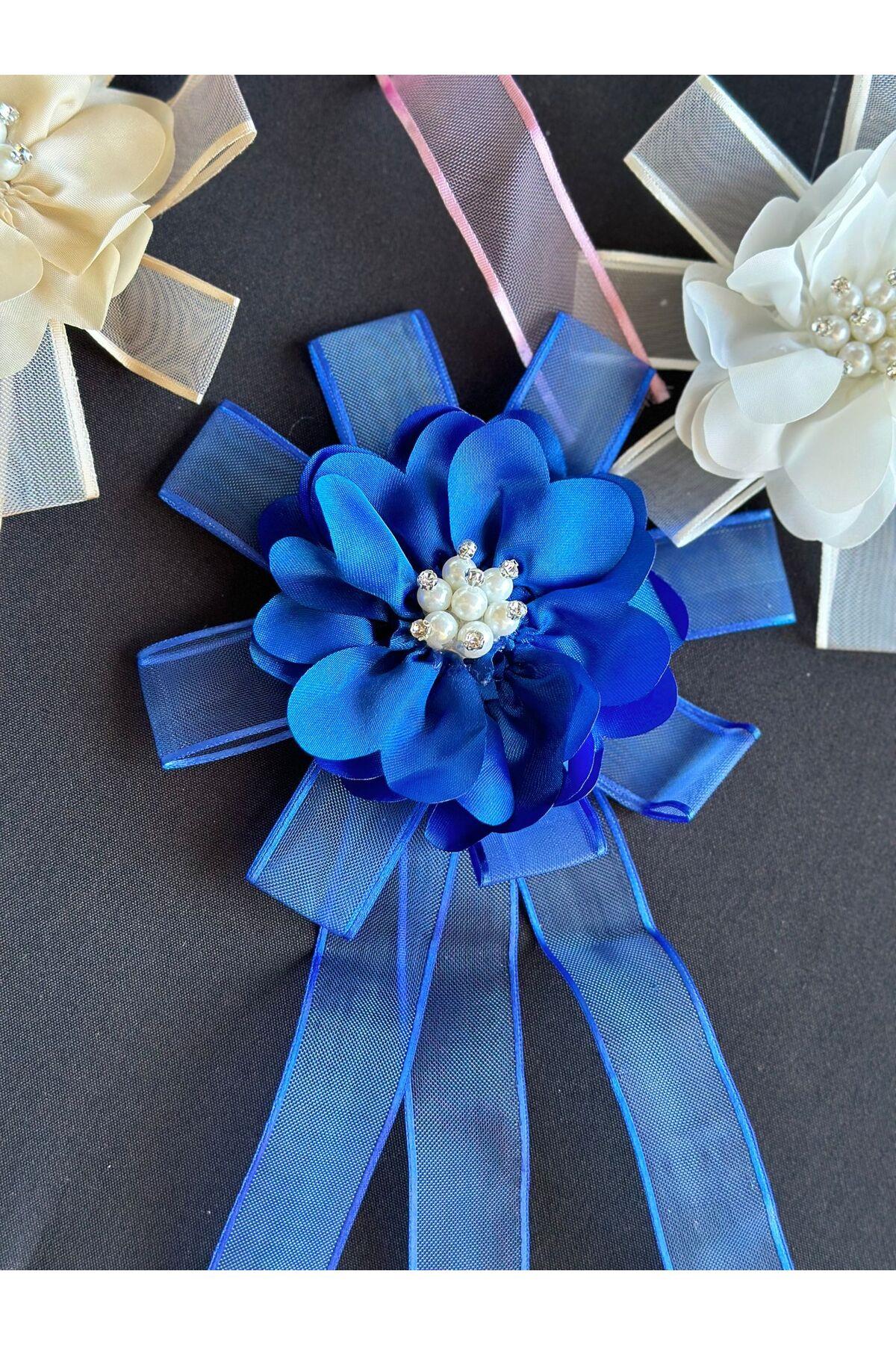 Lüks damat gelin nişan çeyiz bohça çiçeği inci taşlı iğneli broşlu sarkıt kurdel saten gül saks mavi