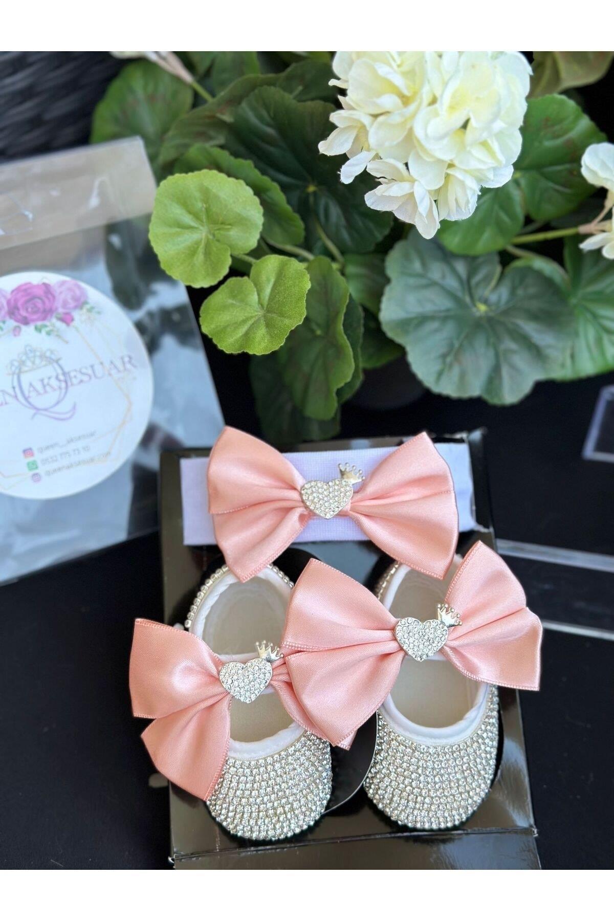 Lüks kristal taşlı kız bebek tasarım kalp broş ayakkabı patik saç bantı yavruağzı fiyonk